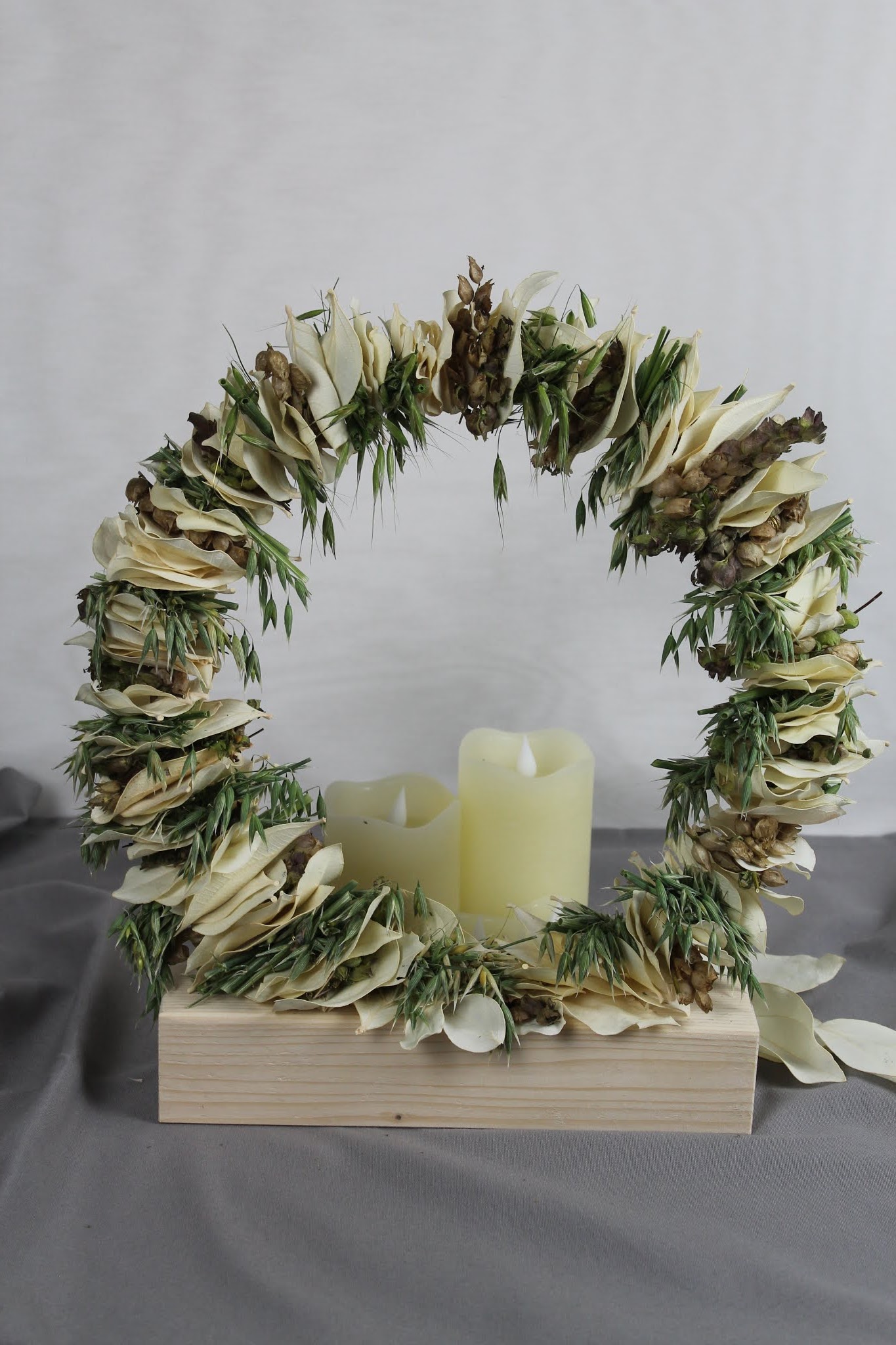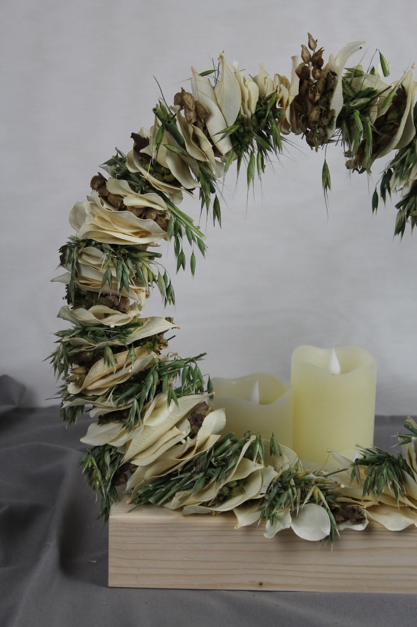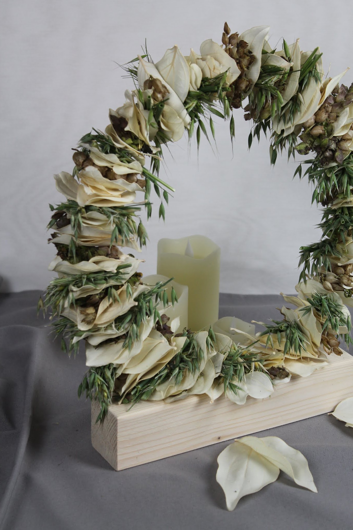 Allerdings ist es schon oft eine halbe Ausbildung zum Floristen bis man die unterschiedlichsten Kranzunterlagen und Materialien für die Herstellung kennt. Mein Kranz, der nicht wie die Klassiker gelegt oder aufgehangen wird, steht auf einem Holzsockel und kann praktischerweise in Regale, auf Fensterbänke oder Sideboards gestellt werden.