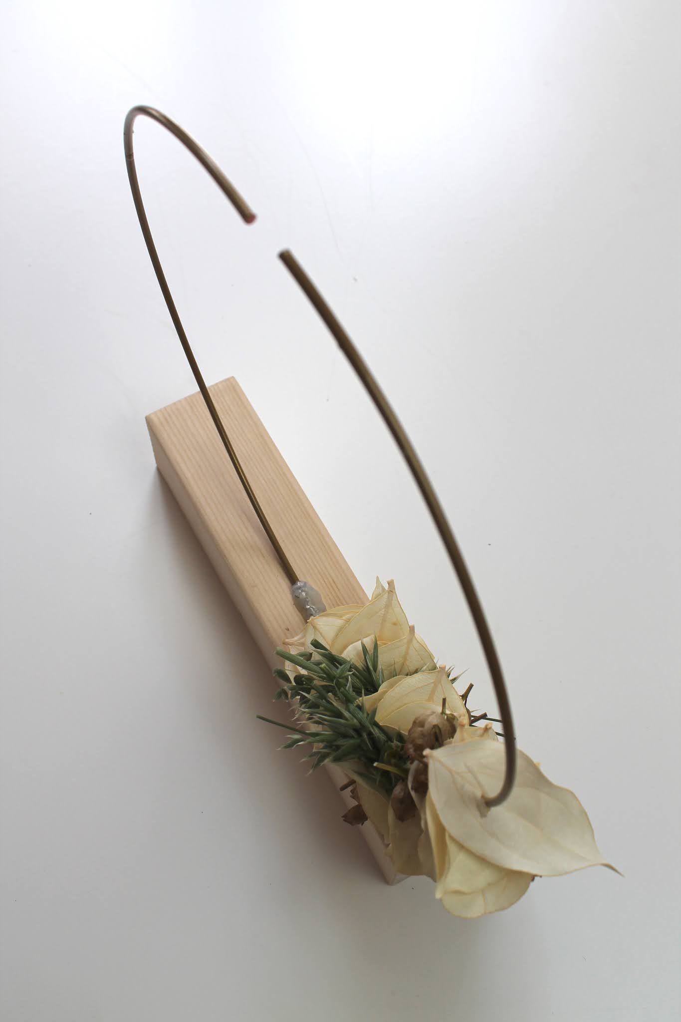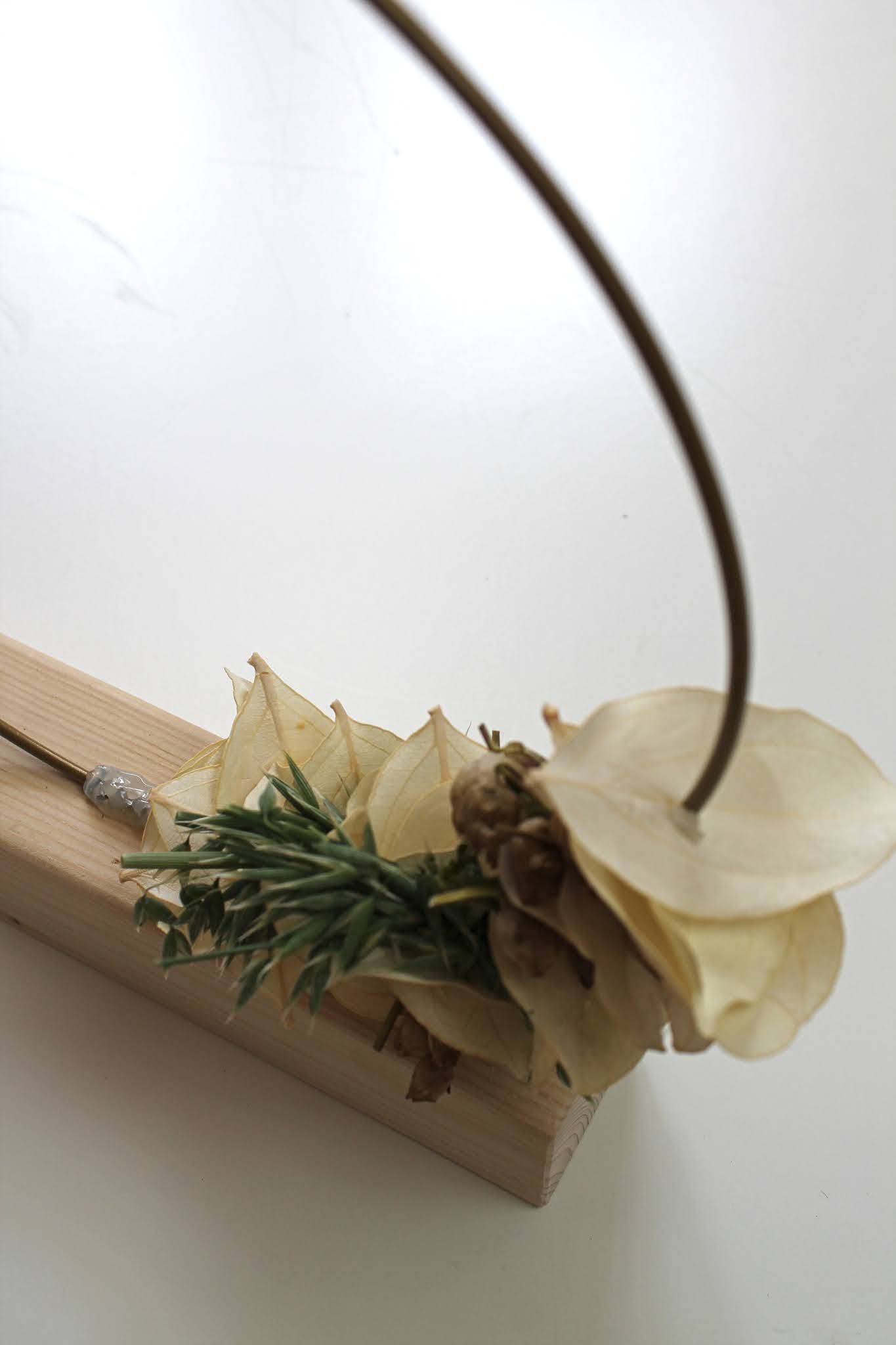 Zwischen 3-8 gesteckten Blätter werden die Grasbündel direkt mit dem Draht an dem Metallreif fixiert. Rechts und links den Metallreif bis zur Mitte der Öffnung dekorieren. Die letzten gesteckten Blätter und der Metallreif werden mit Heißkleber fixiert.