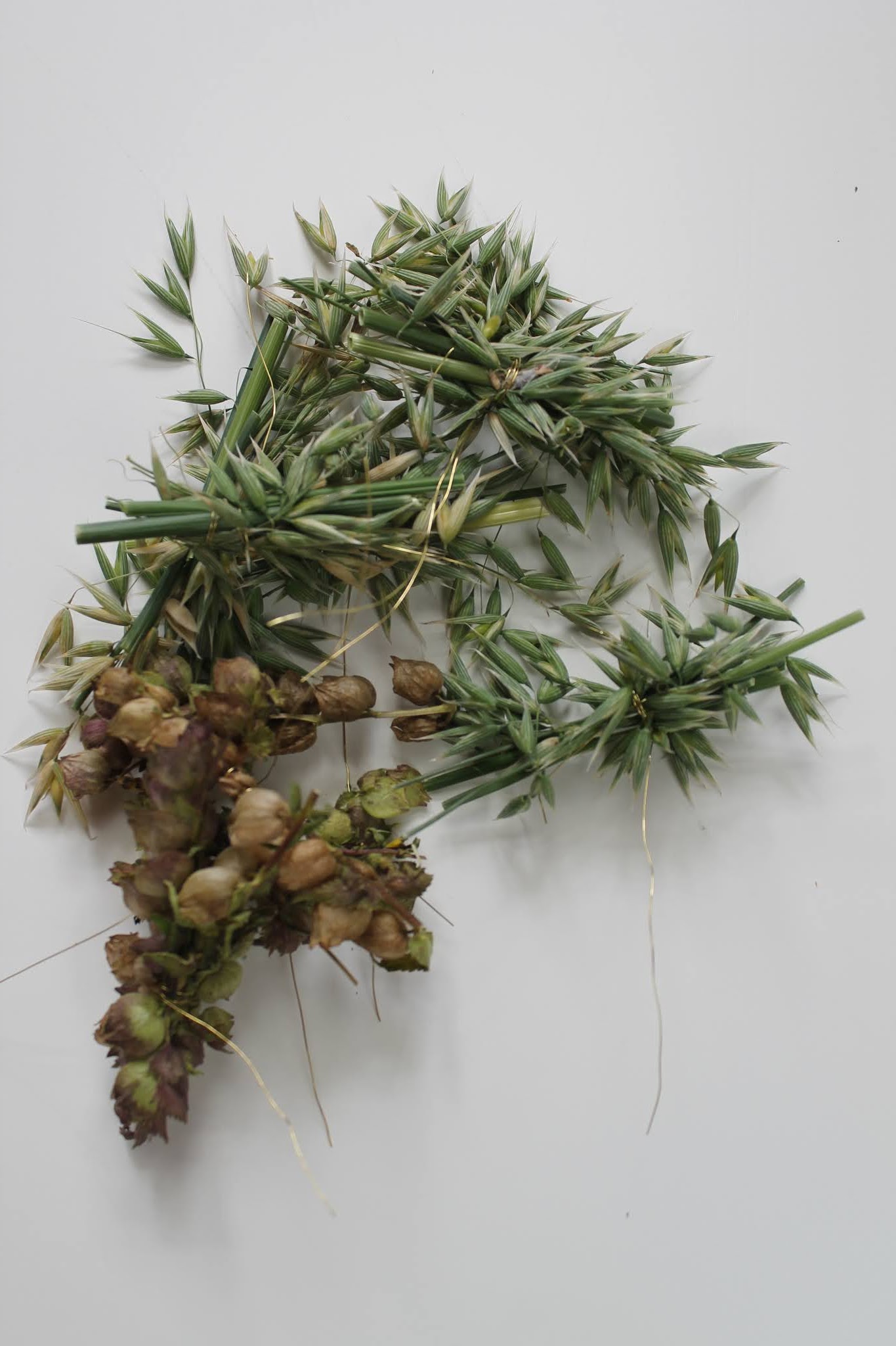 Falls Du diese Materialien nicht findest, kannst Du alternativ Skelettblätter oder im Herbst buntes Laub verwenden. Gräser selber sammeln oder frage Deinen Floristen nach ähnlichen saisonalen Gräsern, die zum Trocknen geeignet sind.
