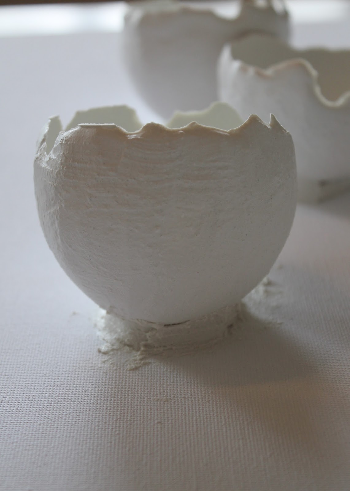 - Damit die Schalen nicht wie geklebt aussehen, noch einmal zusätzlich Instantspachtel am Rand der Schalen auftragen, so wird der Übergang der Schalen zur Leinwand fließender von der Optik.