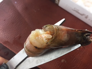 Do ít ai để ý, ngay phần đầu tôm, giữa phần gạch và thân tôm, thường có những con giun sán sống ký sinh. Theo Quynhon11.com, cứ 10 con thì ít nhất bốn con có tình trạng này. Dù tôm bán ở chợ Mỹ hay chợ Á châu cũng đều như thế.